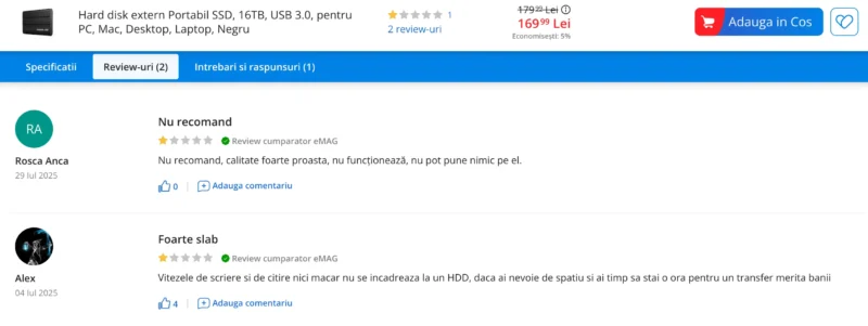 Pe o notă mai serioasă, eram în căutarea unui hard disk portabil, iar când am dat peste această ofertă „prea bună ca să fie adevărată”, mi s-a confirmat imediat că e un produs de evitat. Dacă vă trece prin cap să îl cumpărați, veți pierde timp și bani. Există și o versiune de 16 TB cu doar 30 lei în plus, iar recenziile de acolo confirmă clar că este o țeapă.