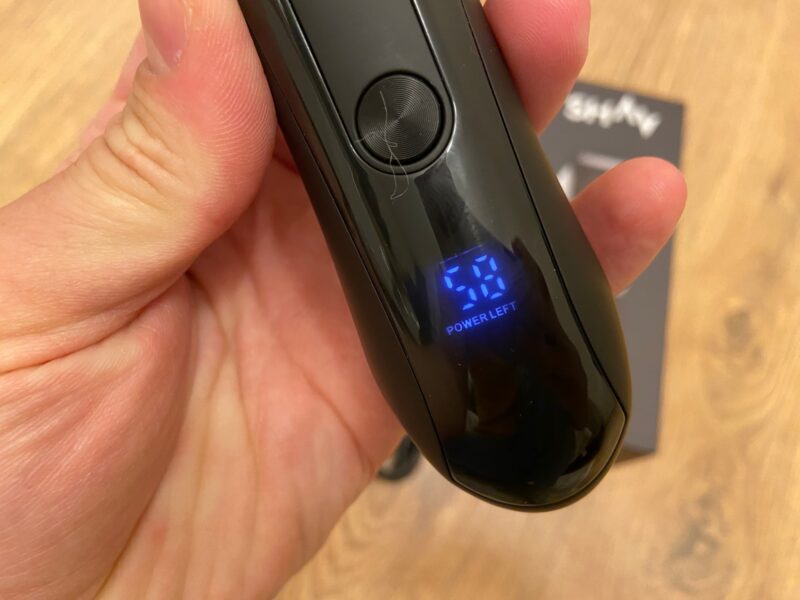 O încărcare completă ar trebui să asigure până la 90 de minute de utilizare, ceea ce înseamnă că nu trebuie pus la încărcat chiar după fiecare folosire. Mi-ar fi plăcut ca încărcarea să se facă prin USB-C, ca să nu mai fie nevoie de acel dock, în caz că te gândești să îl iei în vacanță. Are și un mic display LCD unde găsim informații cu privire la capacitatea bateriei.